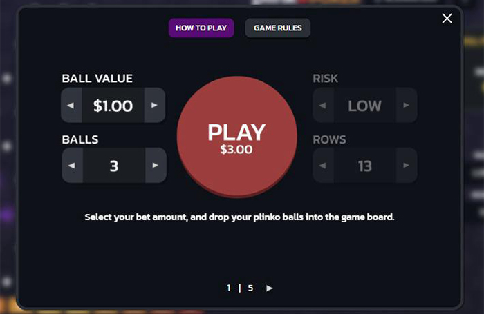 Select your bet amount, and tap the Play button to drop plinko balls onto the game board.