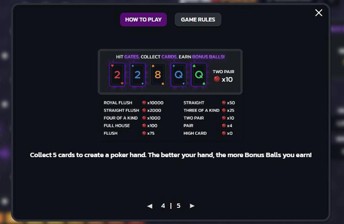 - When a ball passes through a gate, a card is dealt at random from a standard 52-card deck, helping you build the five-card poker hand that can unlock Bonus Balls.